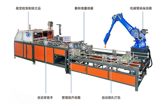 紙箱自動(dòng)化碼垛流水線配置了全自動(dòng)穿提手機(jī)、整理排齊裝置、視覺(jué)檢測(cè)剔除系統(tǒng)、反轉(zhuǎn)堆疊裝置和機(jī)械打包碼垛系統(tǒng)。同時(shí)具備了穿提手后檢測(cè)和剔除不良品、自動(dòng)整理排齊紙箱以及機(jī)械手抓取自動(dòng)捆扎打包碼垛功能。